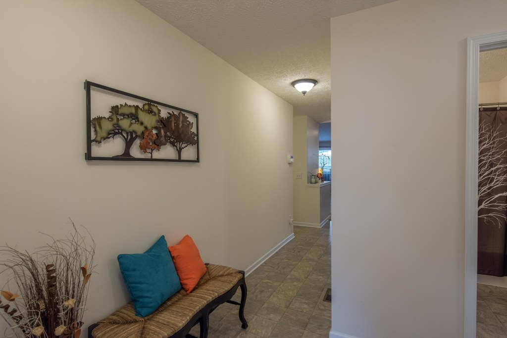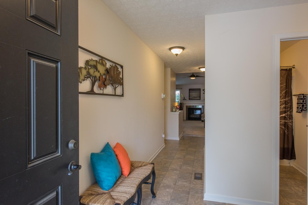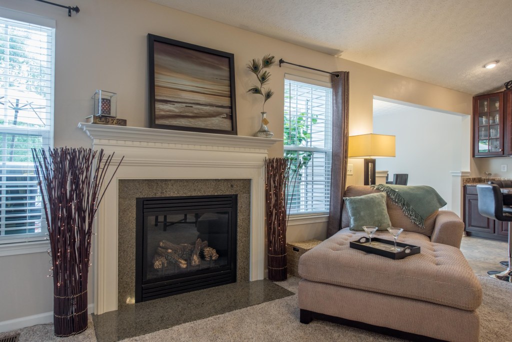 This amazing ranch design welcomes you into the entry foyer with a view of the beautiful gas fireplace with granite surround, framed by an ornate oak mantel in white.