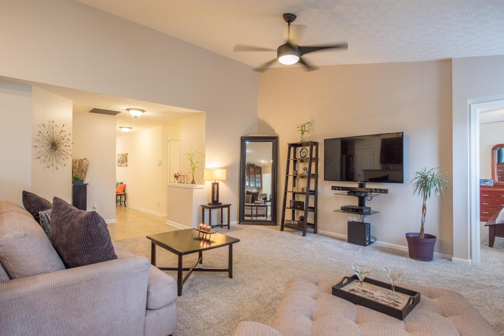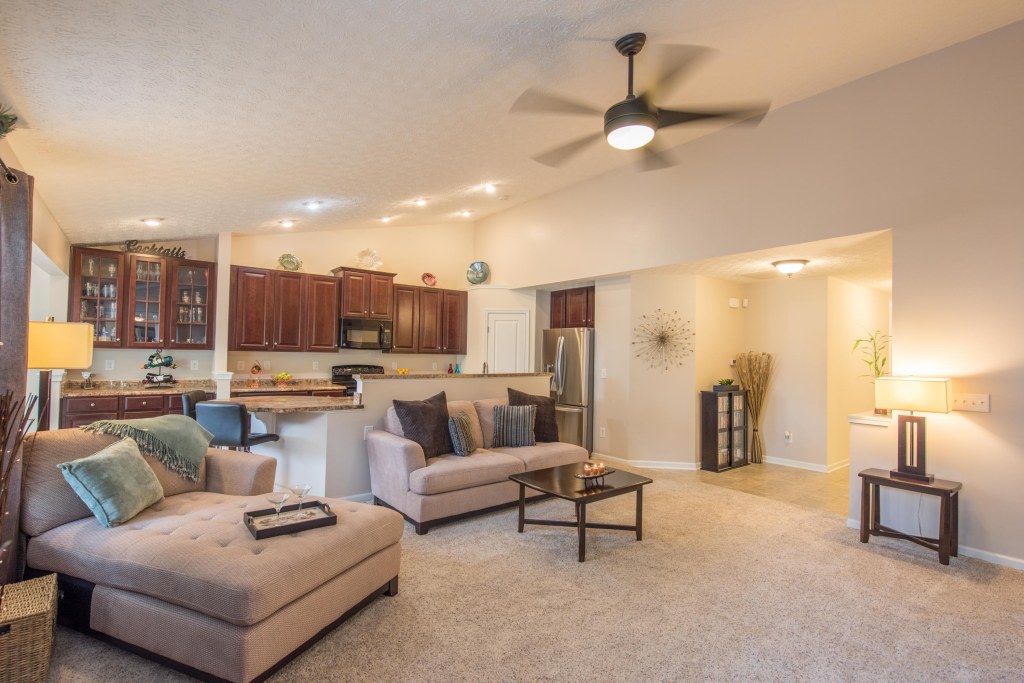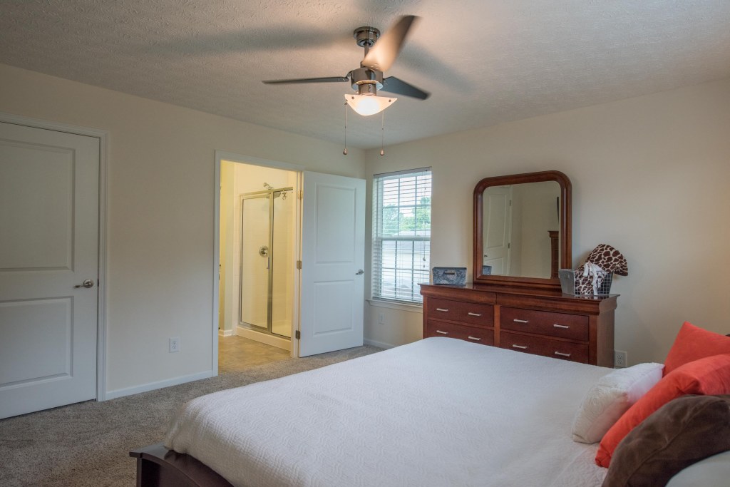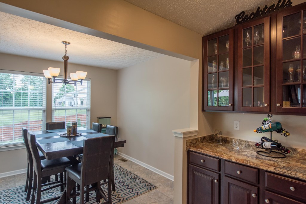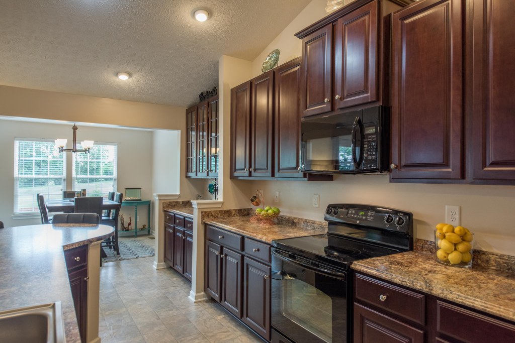 As you enter the spacious great room with vaulted ceiling and decorative ceiling fan, the massive open kitchen draws you in with the upgrade 42″ staggered cherry cabinets featuring custom hardware and glass facing.