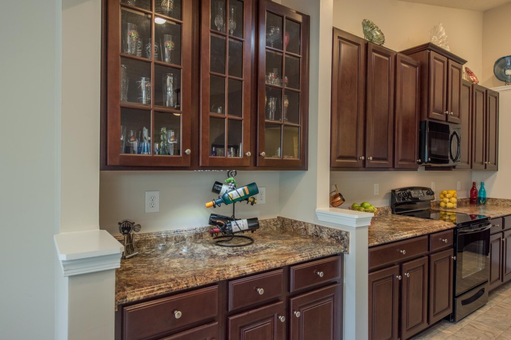 Plenty of counter space awaits including a deluxe island with bar top and eating space, plus a butler/serving area. This intelligent design allows for multiple workflows with the large corner pantry and refrigerator beside the primary preparation area for easy access.