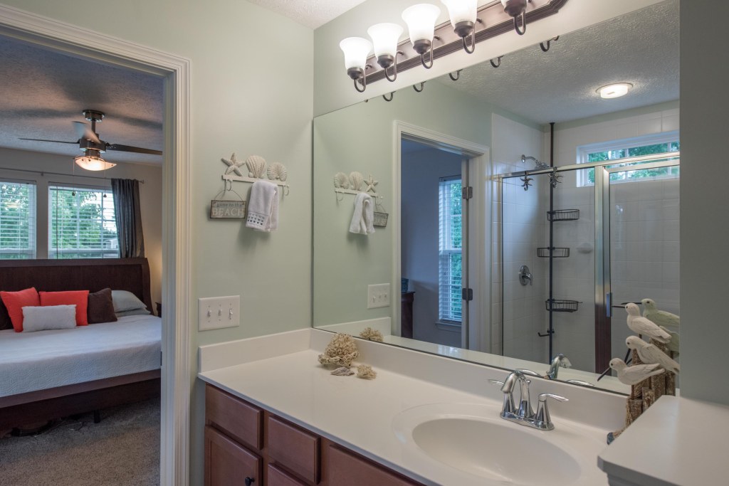 The private master retreat offers a walk-in closet and large master bath featuring custom cabinets with raised vanity and an over-sized shower with ceramic tile, semi-frameless door and gorgeous transom window.