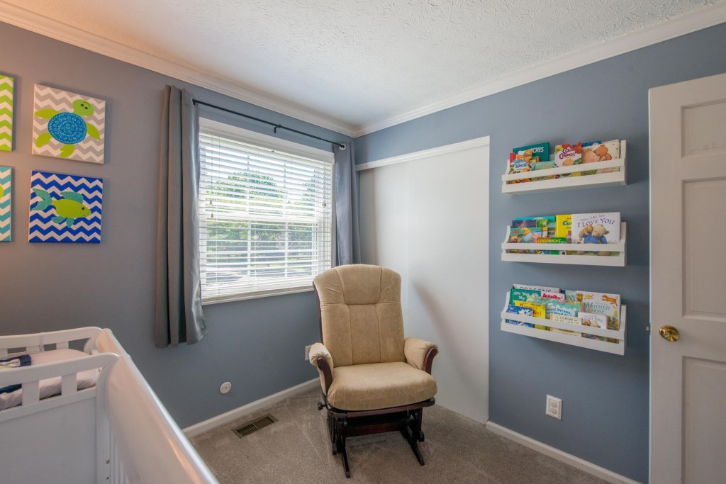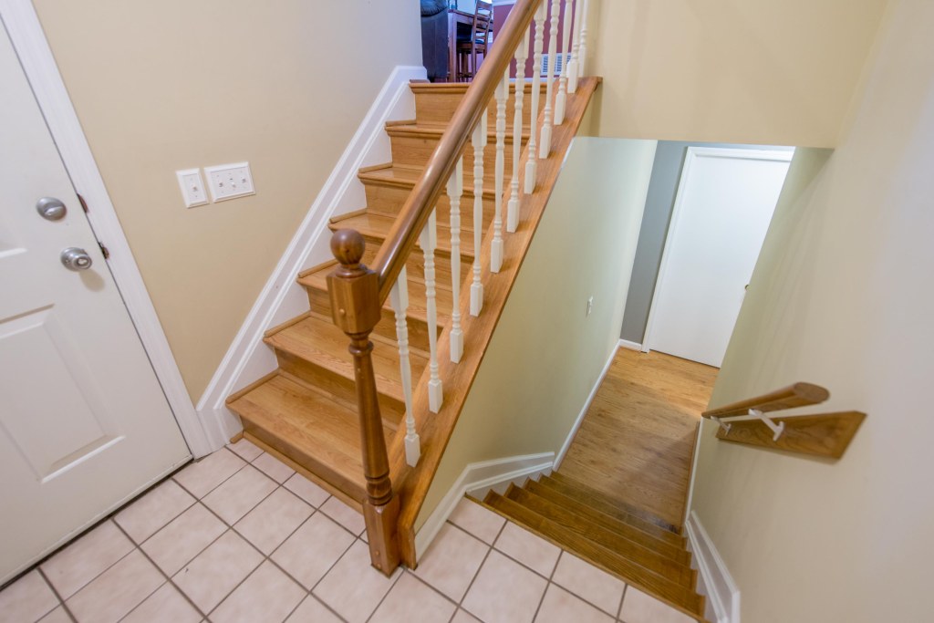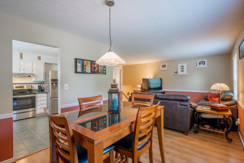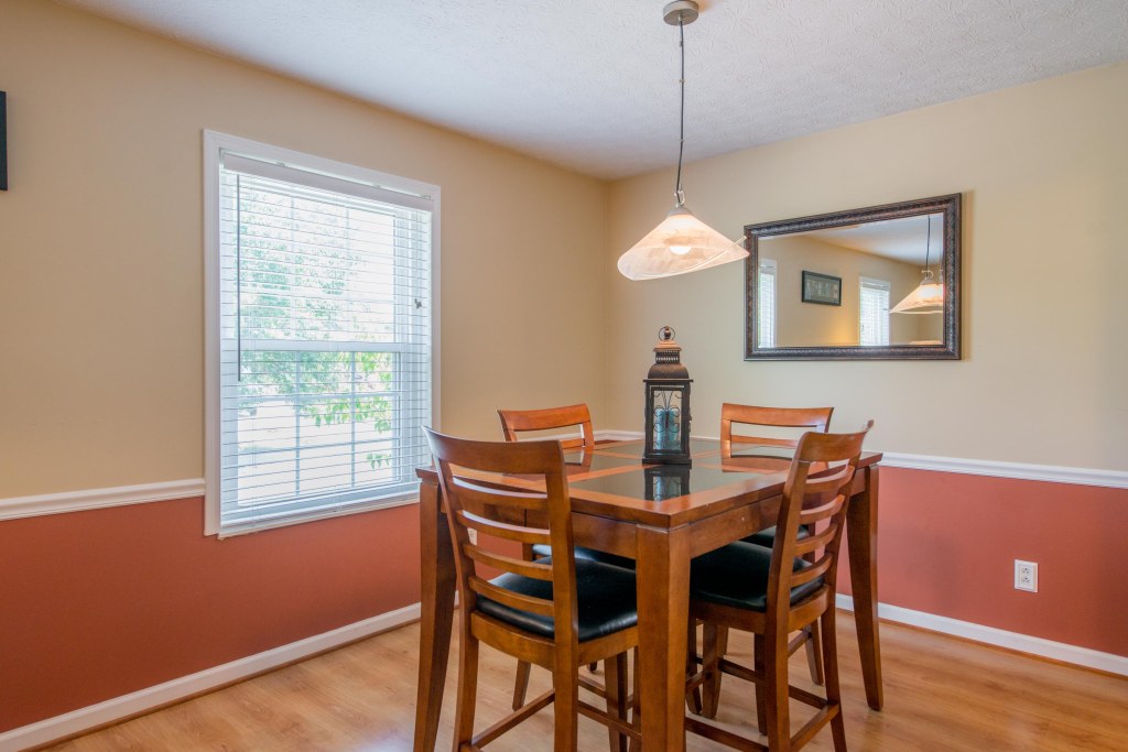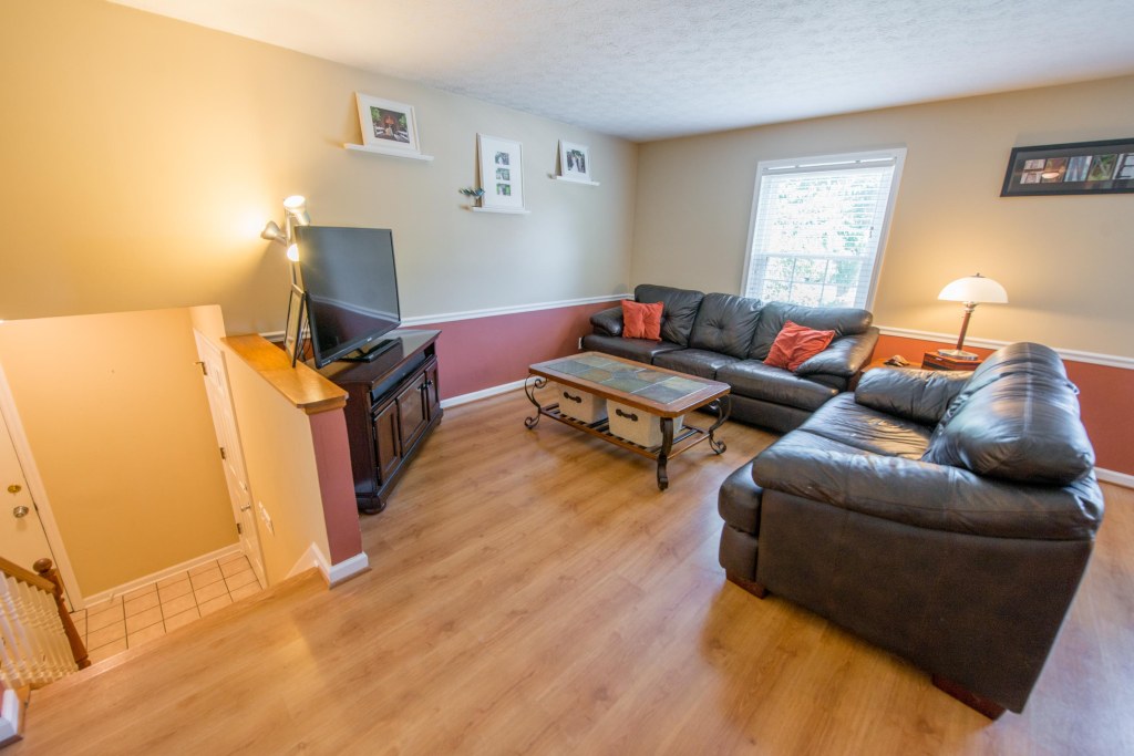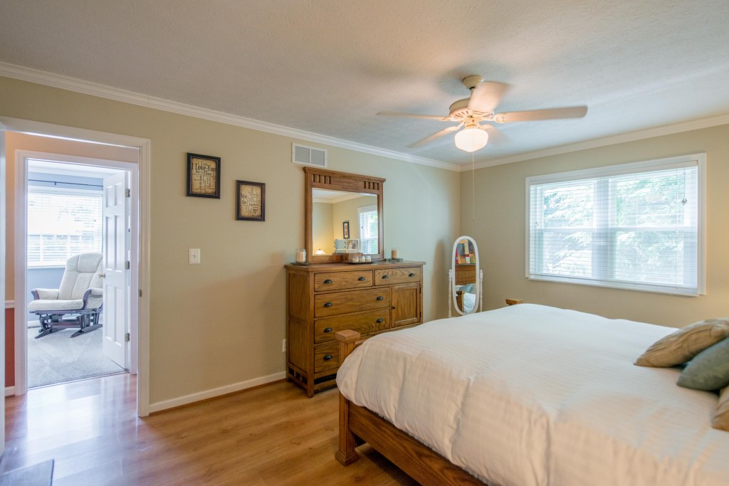 Upstairs has beautiful laminate flooring throughout the living room, dining room, hallway and massive master suite. Details include crown molding and chair rail highlights, white trim, doors and kitchen cabinets.